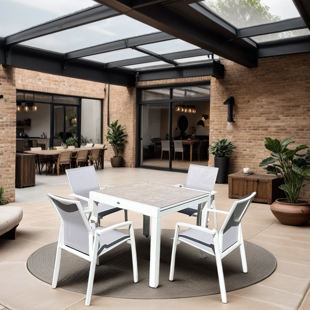 Juego de comedor con mesa extensible de aluminio blanco. Tablero de cristal cerámico imitación piedra + 4 Sillas aluminio blanco y textilene color gris.