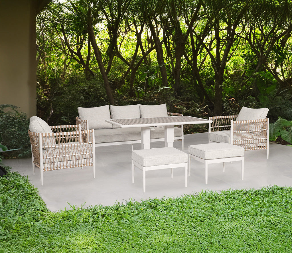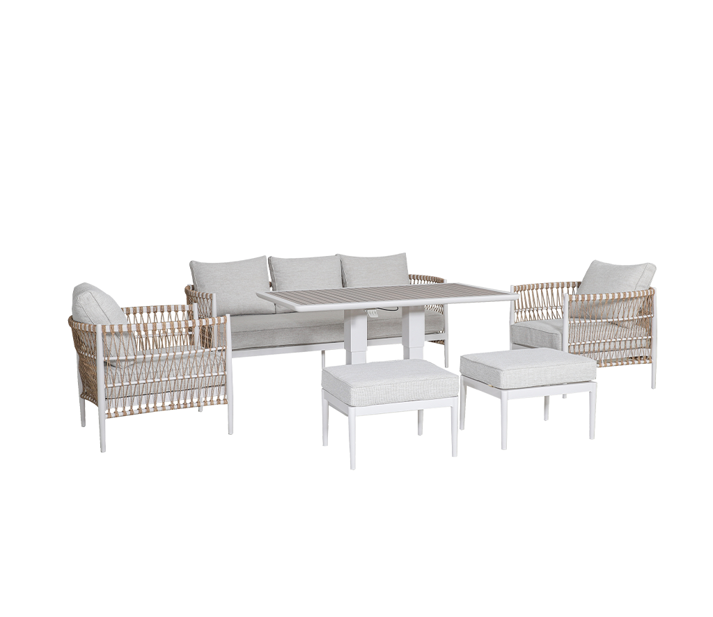 Set de aluminio blanco con asiento recubierto de cuerda color natural. Cojinería de olefina de color beige. Mesa elevable de aluminio blanco con tablero de aluminio imitación madera.