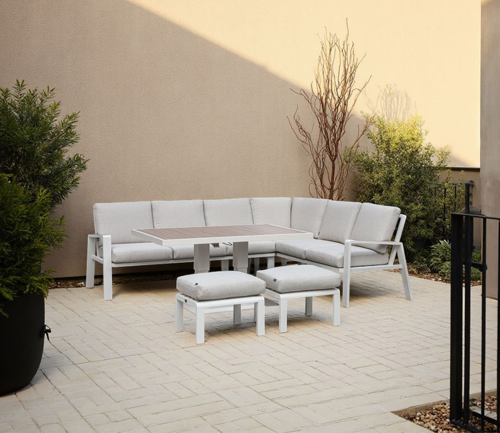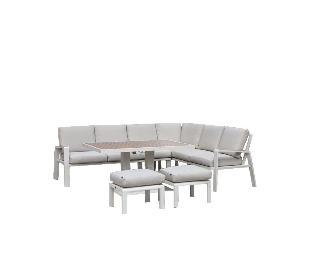 Set de aluminio blanco compuesto por un sofá esquinero + 2 reposapiés + 1 mesa elevable. Tablero de mesa y reposabrazos de aluminio imitación madera. Cojinería de olefina color gris.