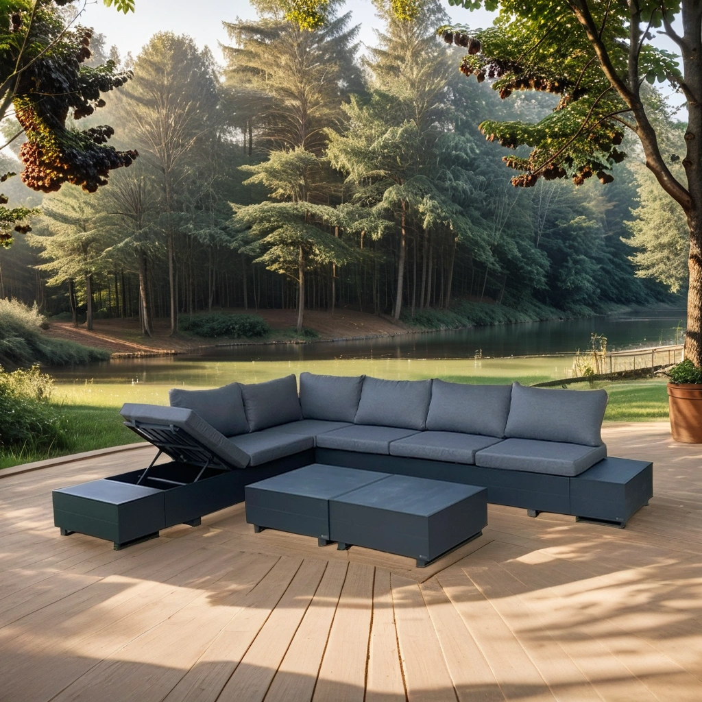 Conjunto de aluminio compuesto por 2 sofás de 3 plazas, 2 mesas laterales y 2 mesas de centro. Aluminio blanco. Cojinería en color gris. Mesas de aluminio con cristal cerámico gris.Asiento exterior elevable con efecto tumbona.