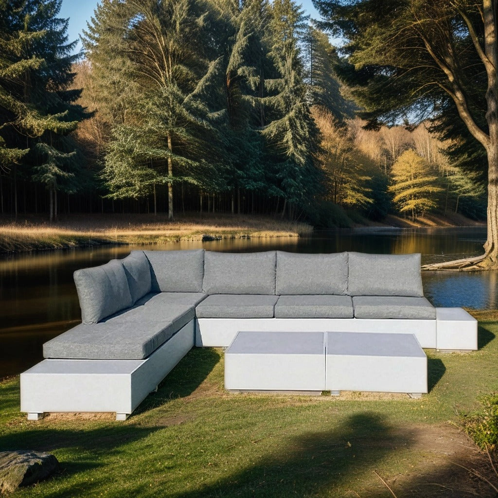 Conjunto de aluminio compuesto por 2 sofás de 3 plazas, 2 mesas laterales y 2 mesas de centro. Aluminio blanco. Cojinería en color gris. Mesas de aluminio con cristal cerámico gris.Asiento exterior elevable con efecto tumbona.