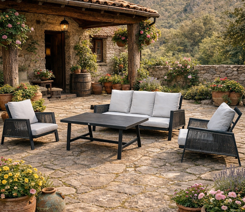 Conjunto de sofá de aluminio y cuerda compuesto por 1 sofá 3 plazas, 2 sillones y mesa alta. Aluminio antracita. Cojinería y cuerda de color gris.