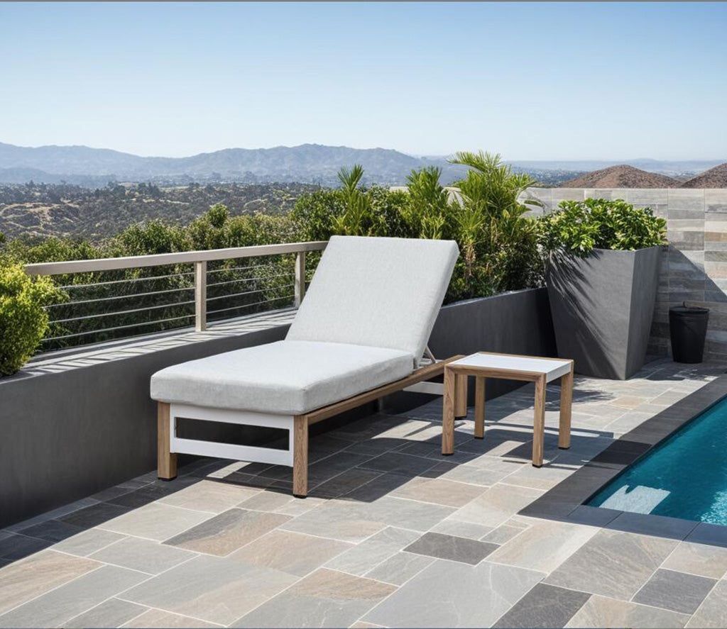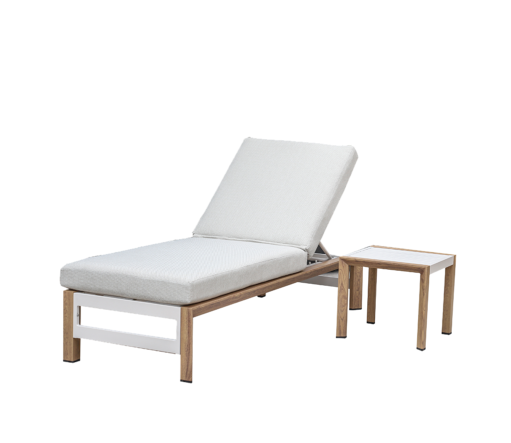 Tumbona de aluminio imitación madera con detalles en blanco, acompañada de una mesita auxiliar de aluminio imitación madera con tablero aluminio blanco. Cojinería de color gris claro.