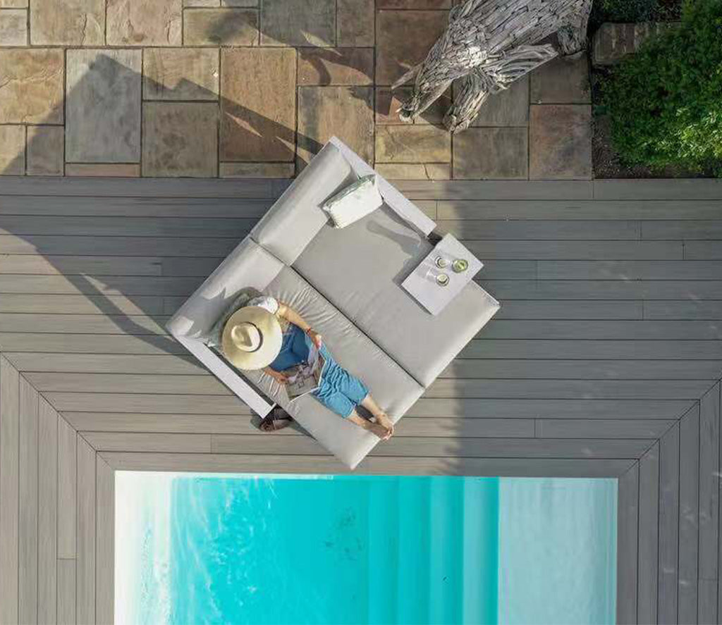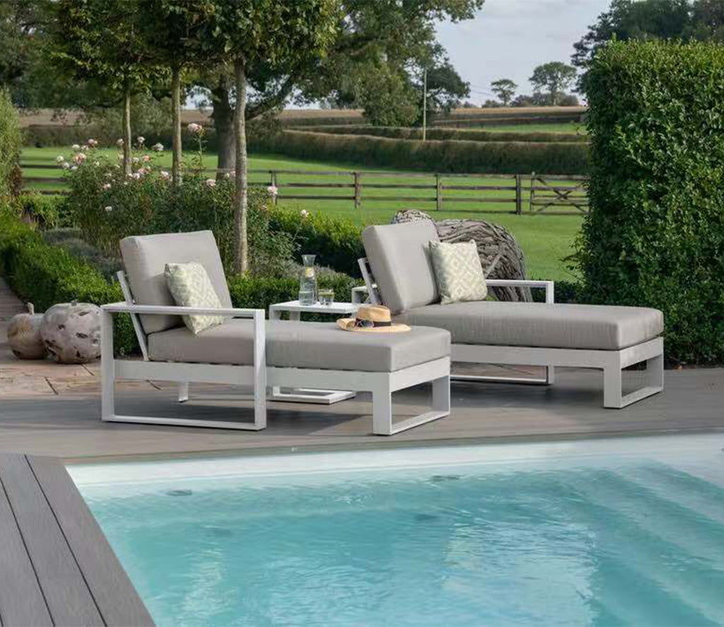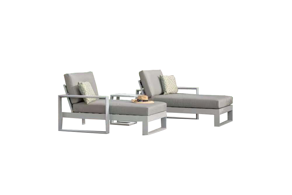 Tumbonas de aluminio blanco, compuesta por dos tumbonas con brazo derecho e izquierdo respectivamente y con mesa auxiliar. Cojinería gris.