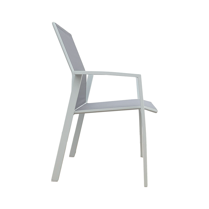 Sillón de aluminio blanco y textilene de color gris. Sillón apilable.